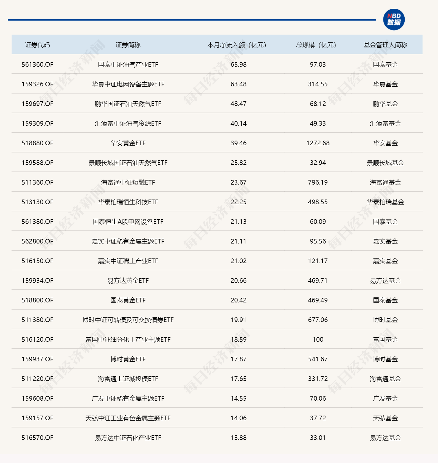 与此同时,国泰中证油气产业ETF基金份额减少12.27亿份,净流出额20.98亿元;富国中证港股通互联网ETF基金份额减少10.00亿份,净流出额7.31亿元;博时上证AAA科创债ETF基金份额减少0.05亿份,净流出额5.02亿元。