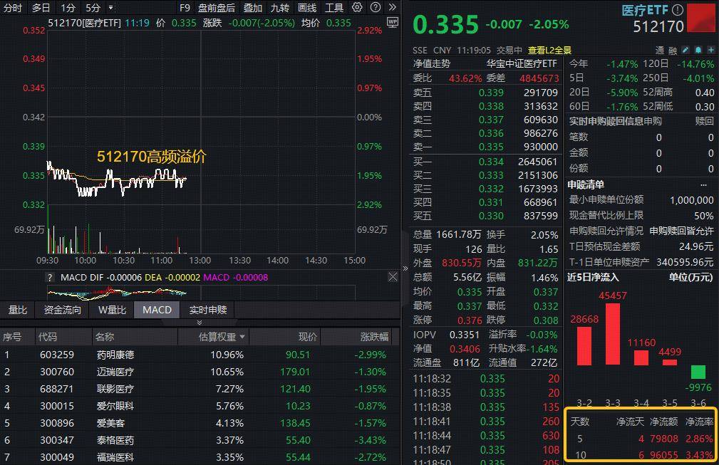 A股方面,医疗板块AI医疗、CXO概念跌幅居前,美年健康、泰格医药跌超3%,全市场规模最大医疗ETF(512170)跌逾2%再失5日均线,场内放量溢价,“抄底”资金或再度增仓,此前10日512170累获9.6亿元净申购。