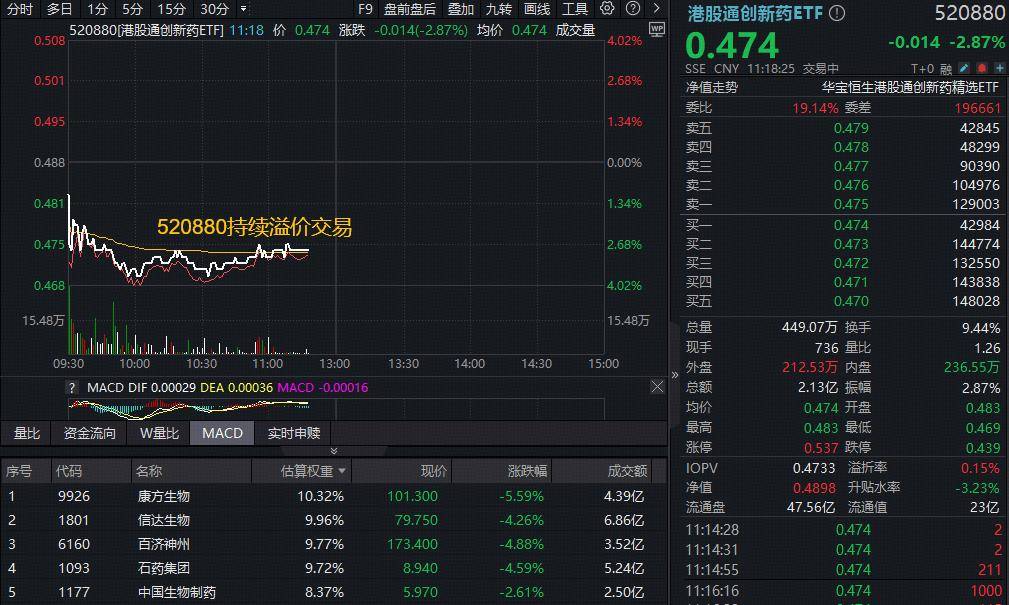港股医药波动更大,100%创新药研发标的——港股通创新药ETF(520880)、港股医疗T+0“利器”——港股通医疗ETF华宝(159137)同跌逾3%,两只ETF场内均呈现宽幅溢价,显示低吸资金涌动。