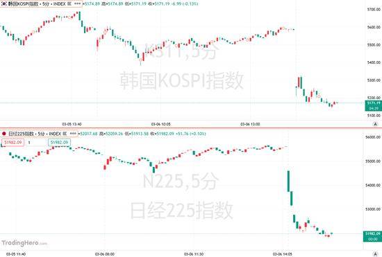 亚太股市明显承压。韩国股市延续上周跌势,基准股指盘初跌超7%,其中芯片巨头三星电子和SK海力士再次成为拖累基准指数的主要力量,三星电子股价跌超7%,SK海力士股价跌超8%。韩国交易所于KOSPI 200指数期货下跌5%后启动KOSPI指数熔断机制,程序化交易暂停5分钟。