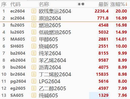 3月9日期货开盘,集运涨停,涨幅20%,原油、燃料油、沥青、甲醇、尿素、烧碱、塑料等均涨停。