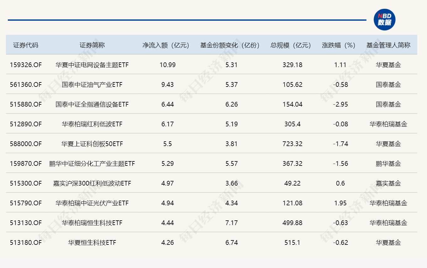 Wind数据显示,在3月9日的非货币ETF市场中,华夏中证电网设备主题ETF基金份额增加5.31亿份,净流入额10.99亿元;国泰中证油气产业ETF基金份额增加5.37亿份,净流入额9.43亿元;国泰中证全指通信设备ETF基金份额增加6.26亿份,净流入额6.44亿元。