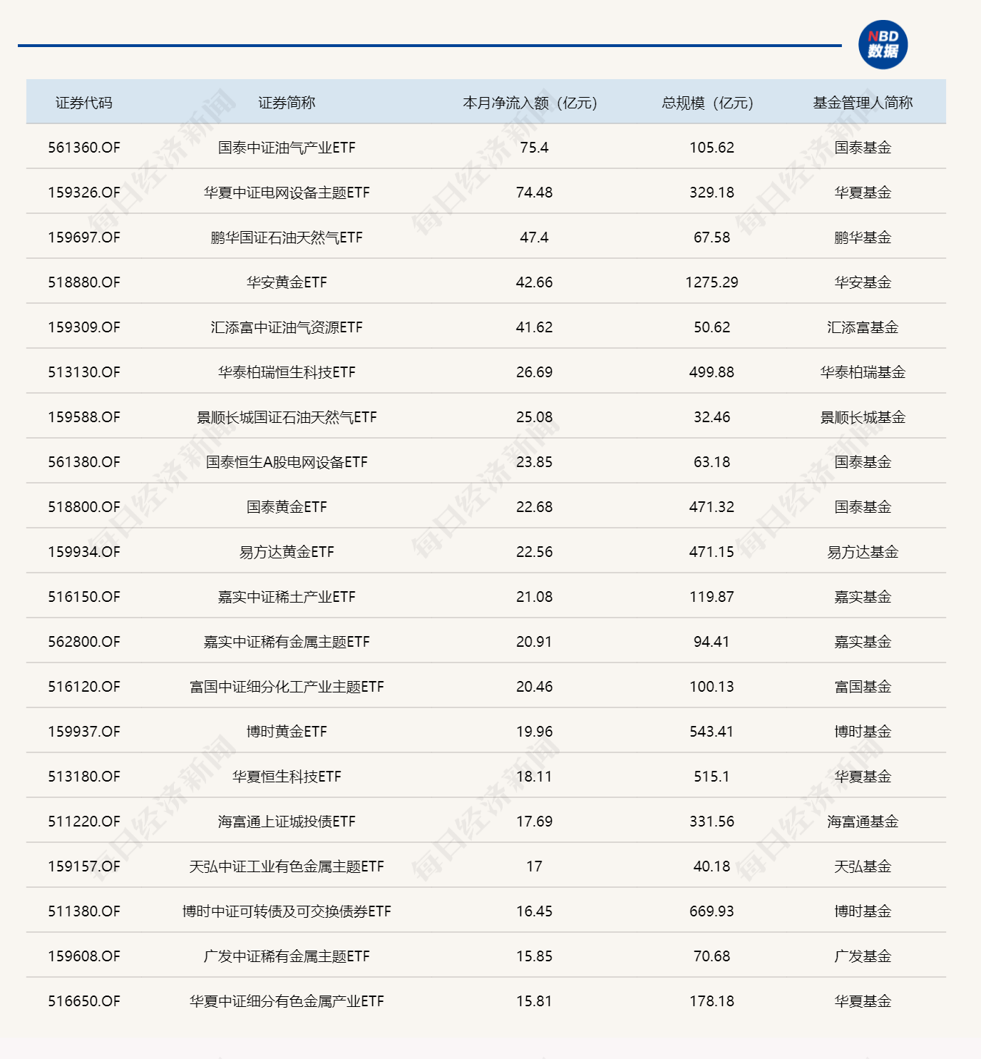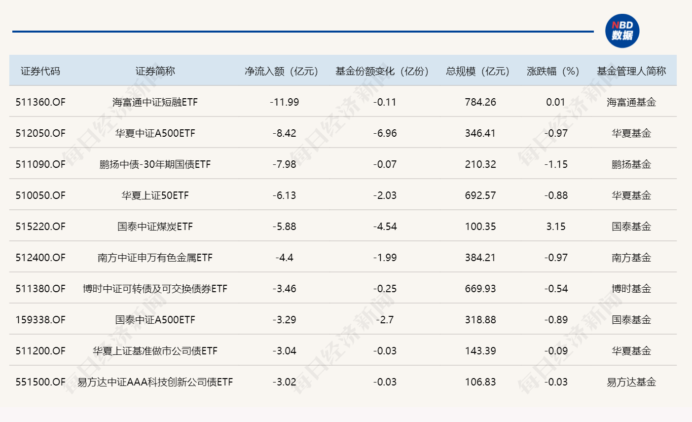 与此同时,海富通中证短融ETF基金份额减少0.11亿份,净流出额11.99亿元;华夏中证A500ETF基金份额减少6.96亿份,净流出额8.42亿元;鹏扬中债-30年期国债ETF基金份额减少0.07亿份,净流出额7.98亿元。