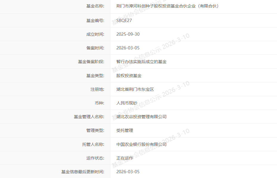 投资界3月10日消息,近日,荆门市首支科创种子基金荆门市漳河科创种子股权投资基金合伙企业(有限合伙)在中国证券投资基金业协会完成备案,标志着荆门市在布局早期科创投资、激活区域创新动能的道路上迈出了实质性步伐。