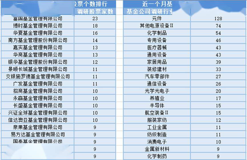 近一个月(2月8日-3月10日),富国基金参与公司调研的数量最多,共调研23家上市公司,此外调研较为活跃的还有博时基金、华夏基金和南方基金,分别调研18家、16家、14家上市公司;从调研行业上来看,基金公司对元件行业的上市公司调研次数最多,共有128次,其次是其他电源设备Ⅱ行业,基金公司调研了74次。