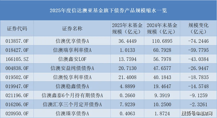 新发产品并未覆盖其他债券产品规模缩水。据《每日财报》梳理,信澳优享债券规模缩水74.24亿元,信澳瑞享利率债规模缩水59.78亿元,信澳鑫安LOF规模缩水43.04亿元,信澳安益纯债债券规模缩水26.94亿元,