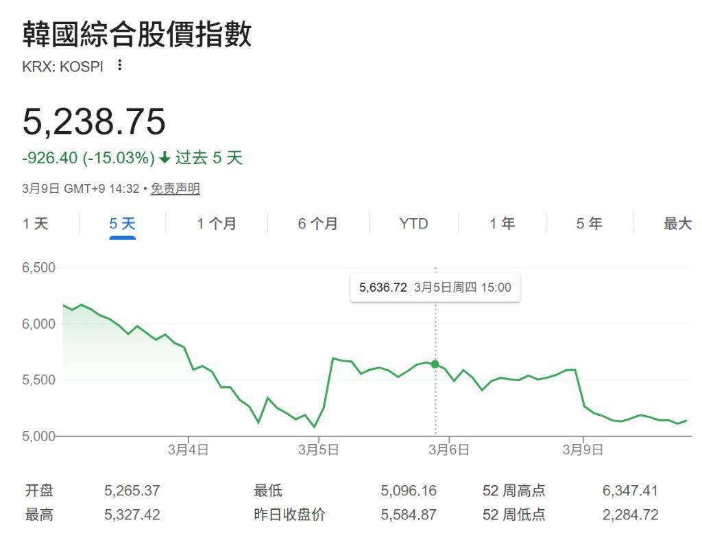 受中东局势持续升温影响,韩国金融市场承压明显。韩国综合股价指数(Kospi)本周一一度下跌8%,本月内第二度触发熔断机制;韩元跌逾1%,逼近1美元兑1500韩元的关键心理关口。