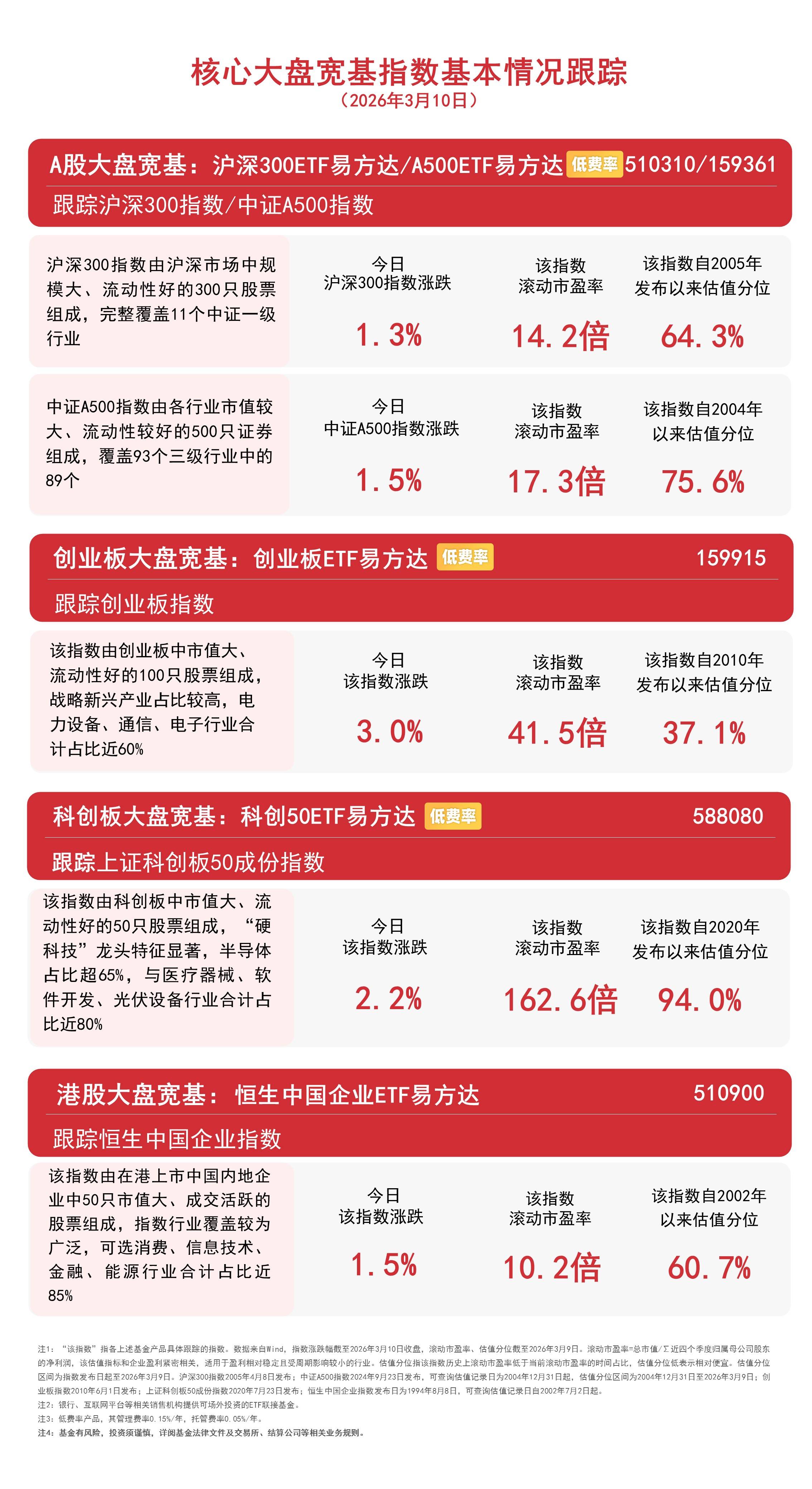 截至收盘,中证A500指数上涨1.5%,沪深300指数上涨1.3%,创业板指数上涨3.0%,上证科创板50成份指数上涨2.2%,恒生中国企业指数上涨1.5%。