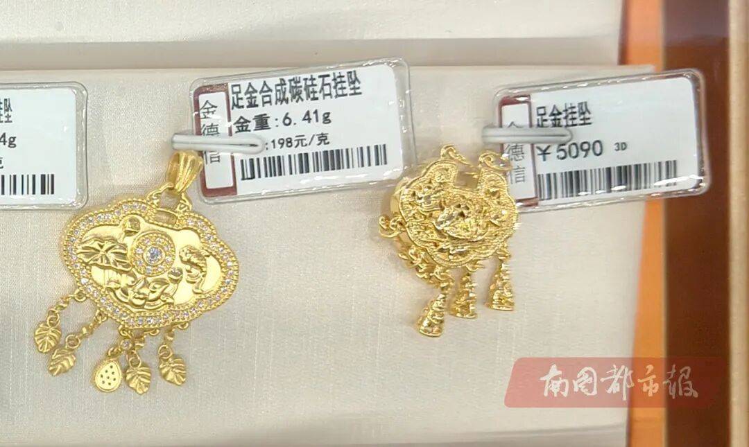 在琼山区周六福珠宝店,“一口价”金手链与克重足金手链混合摆放,价格标签相互层叠,消费者难以快速区分;吊坠区域的“一口价”金饰,价格吊牌被藏在首饰底部,一款售价6000余元的吊坠,标签正面没有标注克重。“这几个吊坠按件销售,款式不同,售价和工费也不同。”店员称,现在以这个价格购买,以后仍可按同样价格换新款,工费多退少补,“还是比较保值的”。