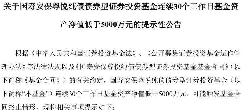 日前,国寿安保基金发布公告称,截至2026年3月2日,国寿安保尊悦纯债债券基金连续30个工作日基金资产净值低于5000万元,可能触发基金合同终止情形。