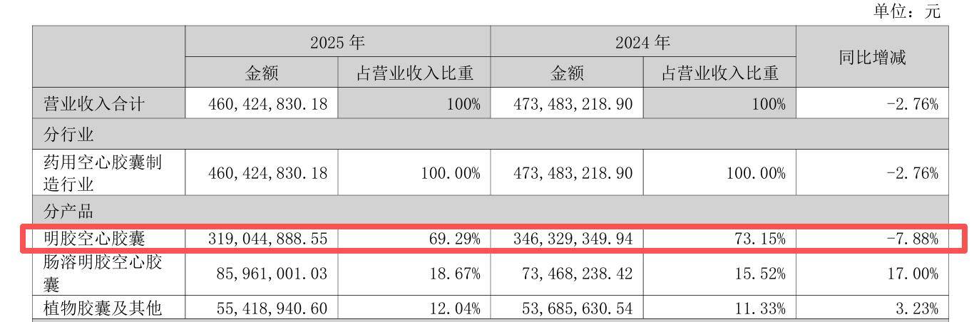 从产品销售结构来看,明胶空心胶囊作为公司营收第一大来源,贡献了近七成收入,但收入同比下滑7.88%;肠溶明胶空心胶囊和植物胶囊等其他产品则表现相对亮眼,营收占比分别为18.67%和12.04%,收入同比分别增长17%和3.23%。