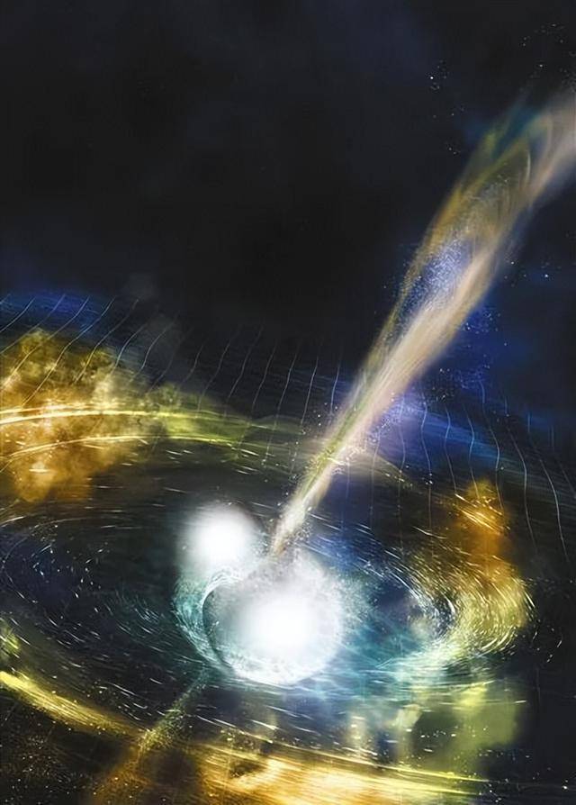 故事到这里开始变得精妙。这个小星系里诞生了很多恒星,其中有两颗大质量恒星走完了一生,坍缩成了中子星。这两颗中子星在引力的驱使下越转越近,经过漫长的螺旋,终于撞在了一起。碰撞产生了那道伽马射线暴的闪光,也产生了金、铂等重元素,抛洒在星系的外围和星系际空间中。