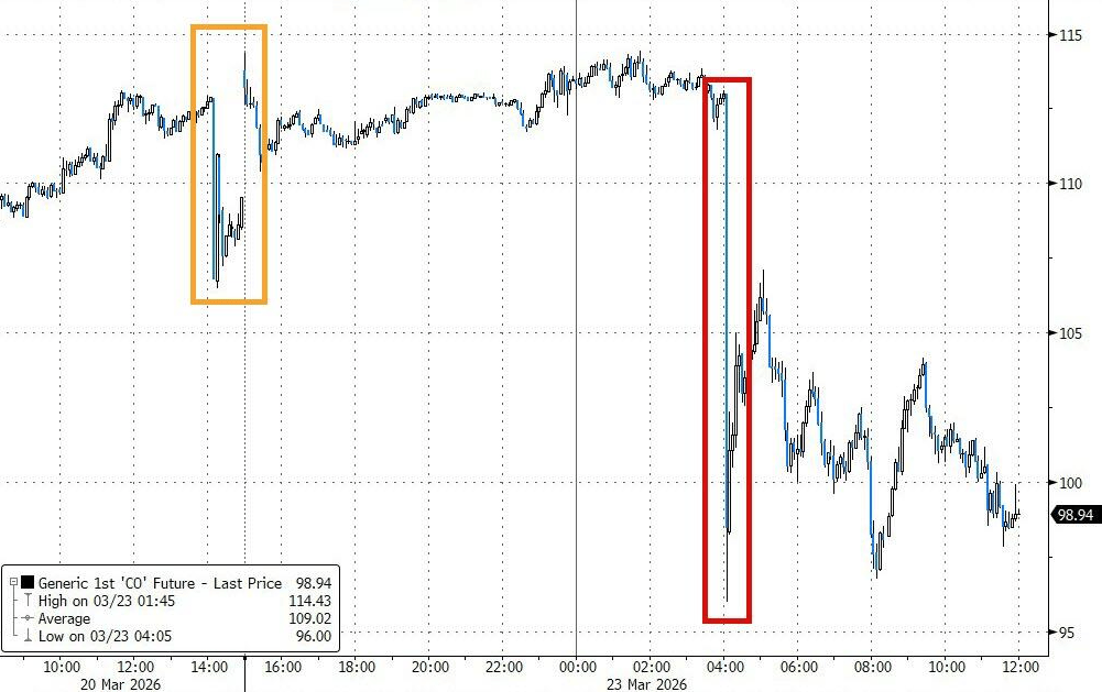 消息一出,市场立刻扭转,布伦特原油跌破每桶100美元,跌幅一度超过13%;美股期货大幅跳涨;两年期美债收益率从高点骤降0.22个百分点至3.79%的低位;欧洲股市和债市也从此前的跌势中急速反弹。