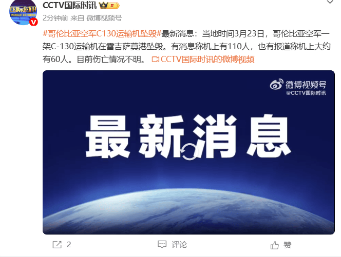 当地时间3月23日,哥伦比亚空军一架C-130运输机在雷吉萨莫港坠毁。有消息称机上有110人,也有报道称机上大约有60人。目前伤亡情况不明。