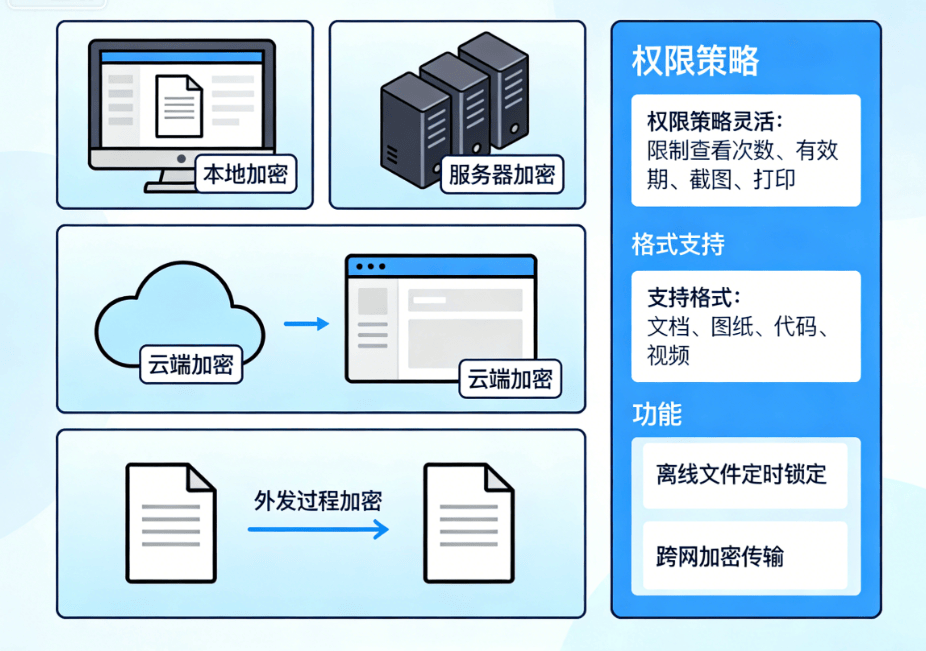 支持多种格式(文档、图纸、代码、视频等),统一策略防护。