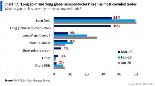 美银美林最新披露的一份全球基金经理调研显示,截至今年3月17日,“做多黄金”依然被认为是最拥挤的交易。尽管基金经理的一致性比例已从2月的50%降低至35%,但黄金仍是基金经理之间对于“交易拥挤”共识最集中的大类资产。