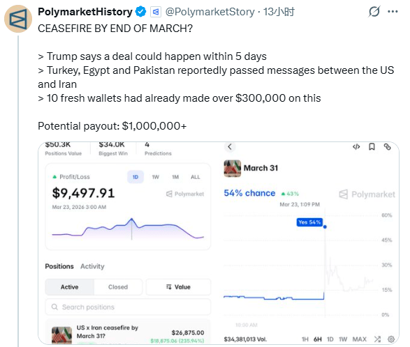 现在,该账户又押注8005美元赌美伊在3月31日前停火,并追加押注15614美元赌停火在4月15日前发生。这两笔押注的价值目前已经增加了超过3万美元。