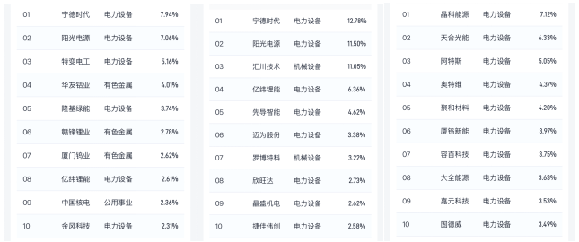 注:资料来源指数直通车小程序,数据截至2026年2月27日,从左到右依次为中证新能源、创业板新能源、科创板新能源指数前十大成份股。