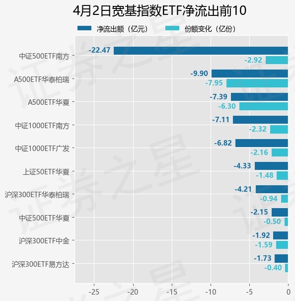 当日有67只宽基指数ETF基金出现资金净流出,其中净流出排首位的是中证500ETF南方(510500),份额减少了2.92亿份,净流出额为22.47亿元。