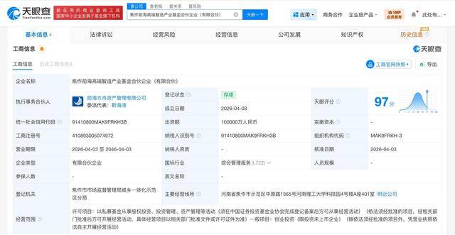天眼查工商信息显示,近日,焦作前海高端智造产业基金合伙企业(有限合伙)成立,执行事务合伙人为前海方舟资产管理有限公司,出资额10亿人民币,经营范围包括以私募基金从事股权投资、投资管理、资产管理等活动,创业投资。合伙人信息显示,该基金由焦作市高质发展股权投资基金合伙企业(有限合伙)、前海方舟资产管理有限公司共同出资。