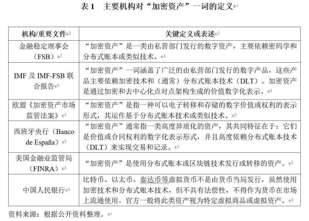 此外,金融稳定理事会(FSB)、欧盟、西班牙央行、美国金融业管理局(FINRA)也对加密资产进行了定义,如表1所示。