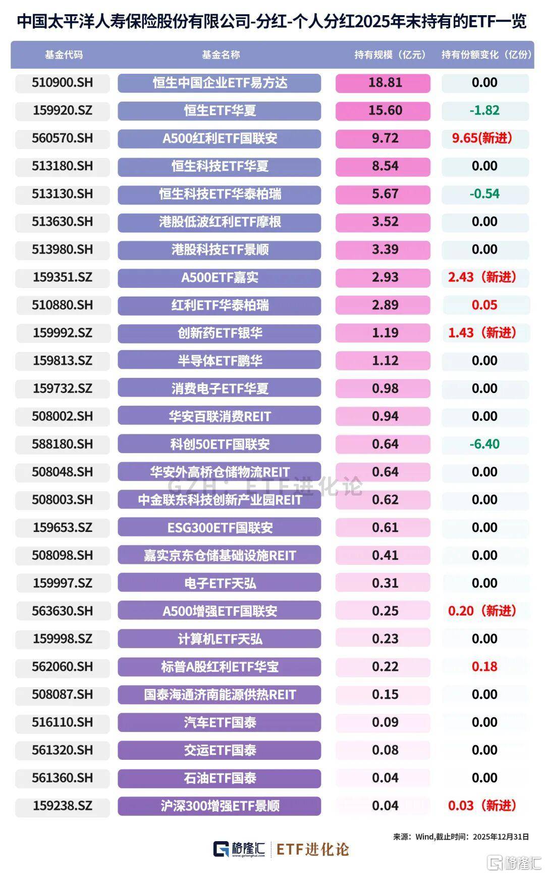 中国太平洋人寿保险股份有限公司-分红-个人分红重仓:恒生中国企业ETF易方达、恒生ETF华夏,新进5只ETF,A500红利ETF国联安、A500ETF嘉实、创新药ETF银华、A500增强ETF国联安、沪深300增强ETF景顺。