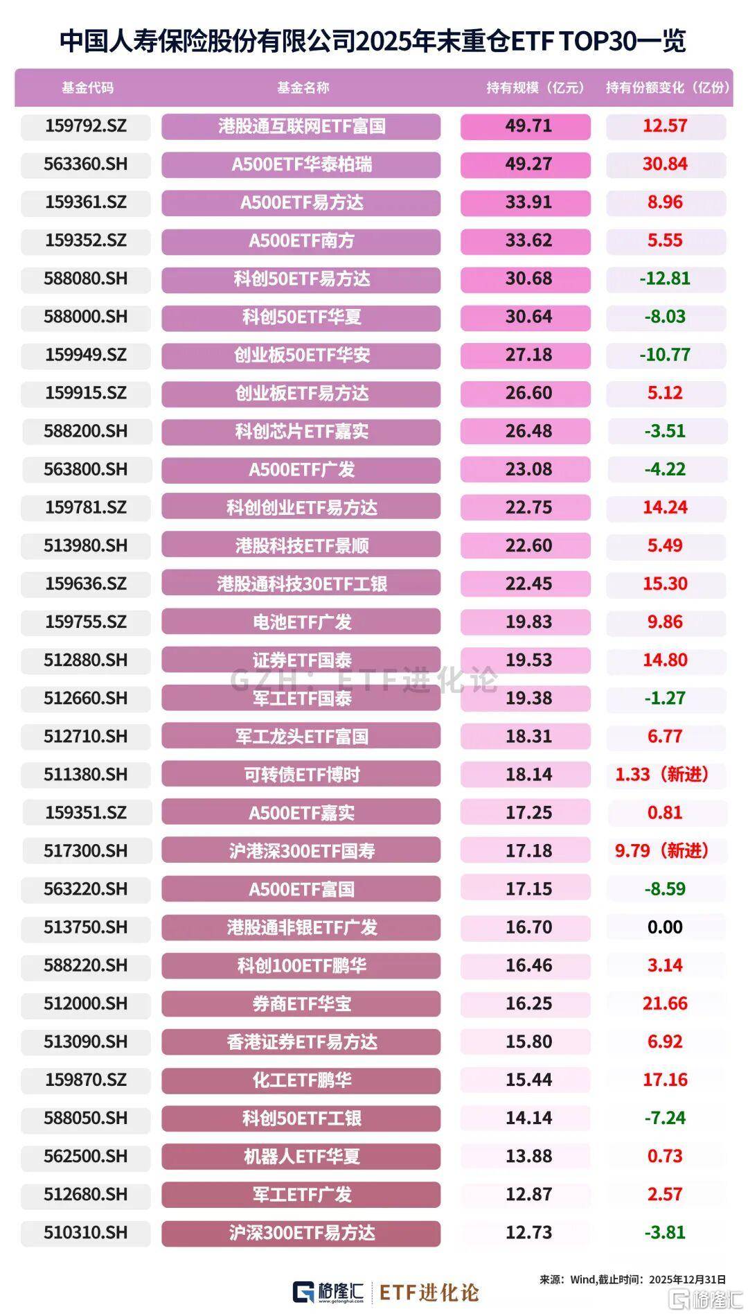 截至2025年年末,中国人寿保险股份有限公司重仓的是港股科技ETF和双创类、中盘宽基ETF,如:港股通互联网ETF富国、A500ETF华泰柏瑞、科创50ETF易方达和创业板50ETF华安。