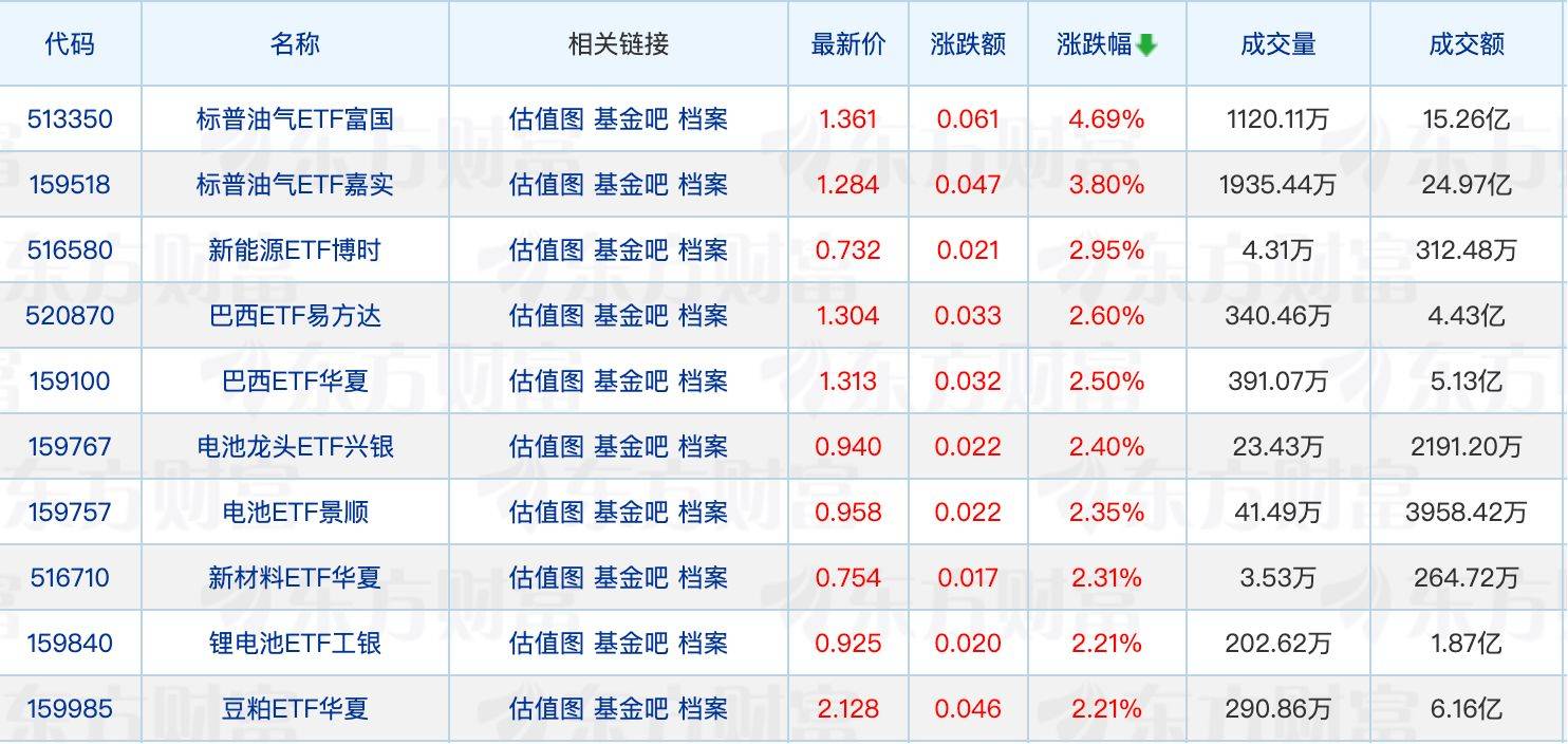 具体来看,标普油气ETF富国领涨4.69%,多只电池相关ETF走强。