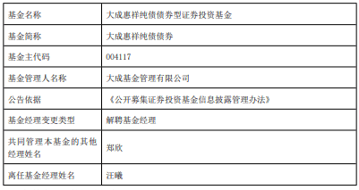中国经济网北京4月13日讯 近日,大成基金公告,汪曦离任大成惠祥纯债债券,郑欣管理。