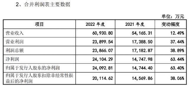 此外,招股书还披露了经过审计的2022年简要财务数据。2022年,公司营业收入、利润总额、净利润分别为6.09亿元、2.39亿元及2.41亿元,较2021年变动幅度分别为12.49%、38.89%及63.44%。