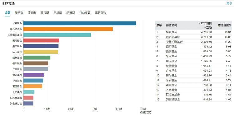 基金管理人方面,华夏基金、易方达基金、华泰百瑞基金ETF管理规模居前,且市场占比超10%;南方基金、嘉实基金、华宝基金、广发基金等6家公募ETF管理规模超千亿元。具体产品方面,规模超过千亿元的均为股票型ETF:华泰柏瑞沪深300ETF的规模为4084.47亿元,易方达沪深300ETF发起式规模超2600亿元,华夏沪深300ETF、嘉实沪深300ETF、华夏上证50ETF、南方中证500ETF、易方达创业板ETF、华夏上证科创板50成份ETF规模超千亿。