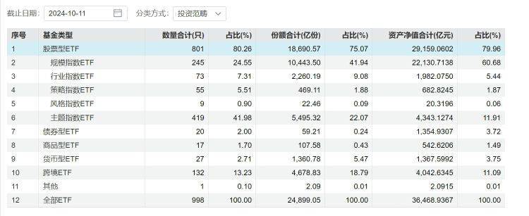 根据Wind数据,截至目前我国全市场ETF共有998只,合计规模接近3.65万亿元。其中,股票型ETF有801只,规模近2.92万亿元,占比近80%;债券型ETF有20只,规模1354.93亿元,占比3.72%;货币型ETF27只,规模为1367.6亿元,占比3.75%;跨境ETF有132只,规模为4042.63亿元,占比11.09%。