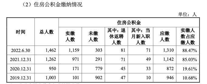 从中不难看出,恒鑫生活对于员工的基本利益没有切实保障。尤其是2019年和2020年,恒鑫生活的社保缴纳比例一度低至五成,在住房公积金方面,更是可以用“离谱”来形容,实际缴纳人数占应缴人数的比例甚至不足20%,直至2021年,员工福利保障方面才逐渐开始提高。