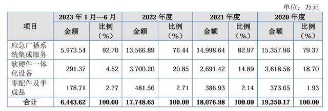 2020年—2022年,应急广播系统集成服务收入占图南电子主营业务收入的比例分别为79.37%、82.97%、76.44%。2023年上半年,随着客户结构和需求变动,集成服务占比增加至92.70%。
