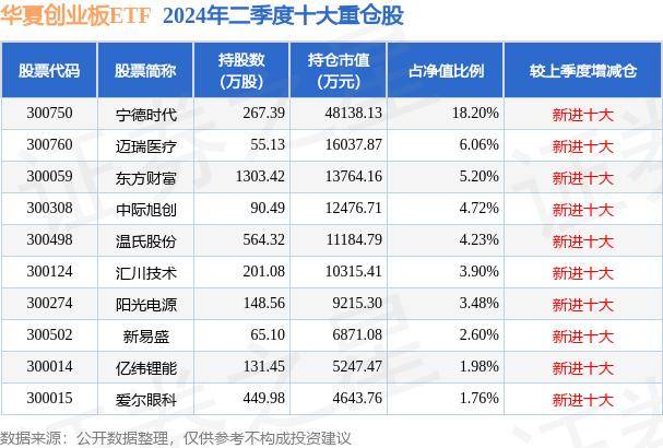 华夏创业板ETF为指数型-股票基金,根据最新一期基金季报显示,该基金资产配置:股票占净值比99.81%,无债券类资产,现金占净值比0.27%。基金十大重仓股如下: