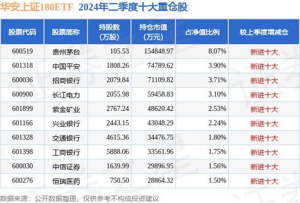 华安上证180ETF为指数型-股票基金,根据最新一期基金季报显示,该基金资产配置:股票占净值比99.54%,无债券类资产,现金占净值比0.52%。基金十大重仓股如下: