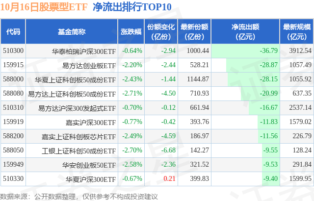 当日有626只股票型ETF基金出现资金净流出,其中净流出排首位的是华泰柏瑞沪深300ETF(510300),份额减少了2.94亿份,净流出额为36.79亿元。