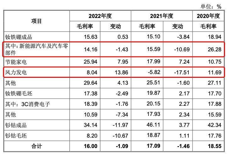 而在广泛被视为风口的新能源汽车及风力发电市场,天和磁材虽然打入了部分巨头供应链,但相关产品毛利率却出乎意料地低于其他传统产品线。
