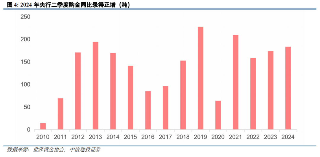 根据世界黄金协会的数据,2024年第二季度全球央行净购金量同比增长了6%至184吨,显示出各国央行对于黄金的需求依然强劲。