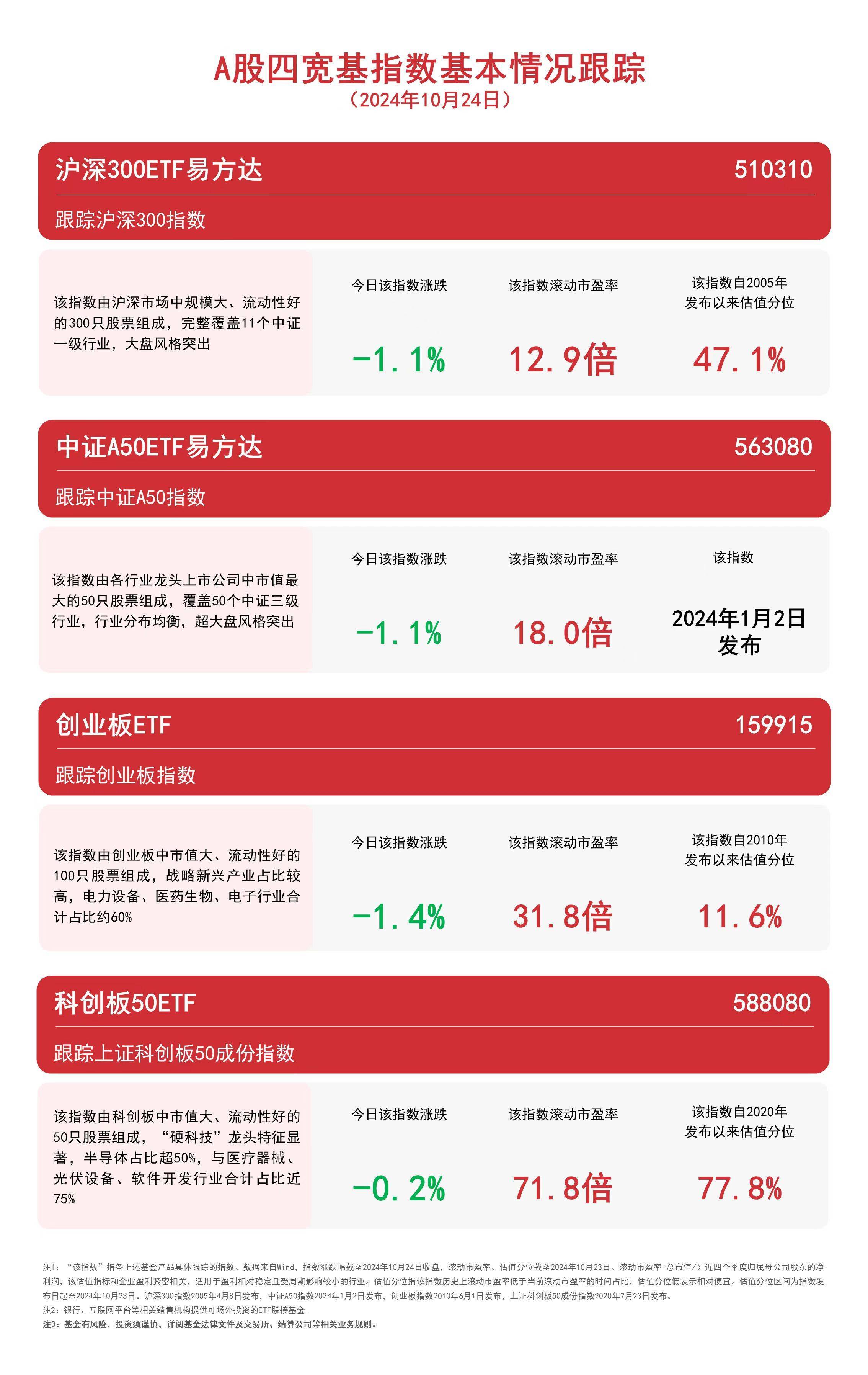 截至收盘,今日中证A50指数下跌1.1%,沪深300指数下跌1.1%,创业板指数下跌1.4%,上证科创板50成份指数下跌0.2%。