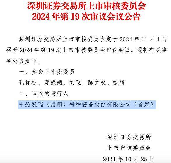 深交所发行上市审核信息显示,2024年11月1日,深交所上市审核委员会召开2024年第19次上市审核委员会审议会议,将审议中船双瑞(洛阳)特种装备股份有限公司(以下简称“双瑞股份”)的首发上市事项。