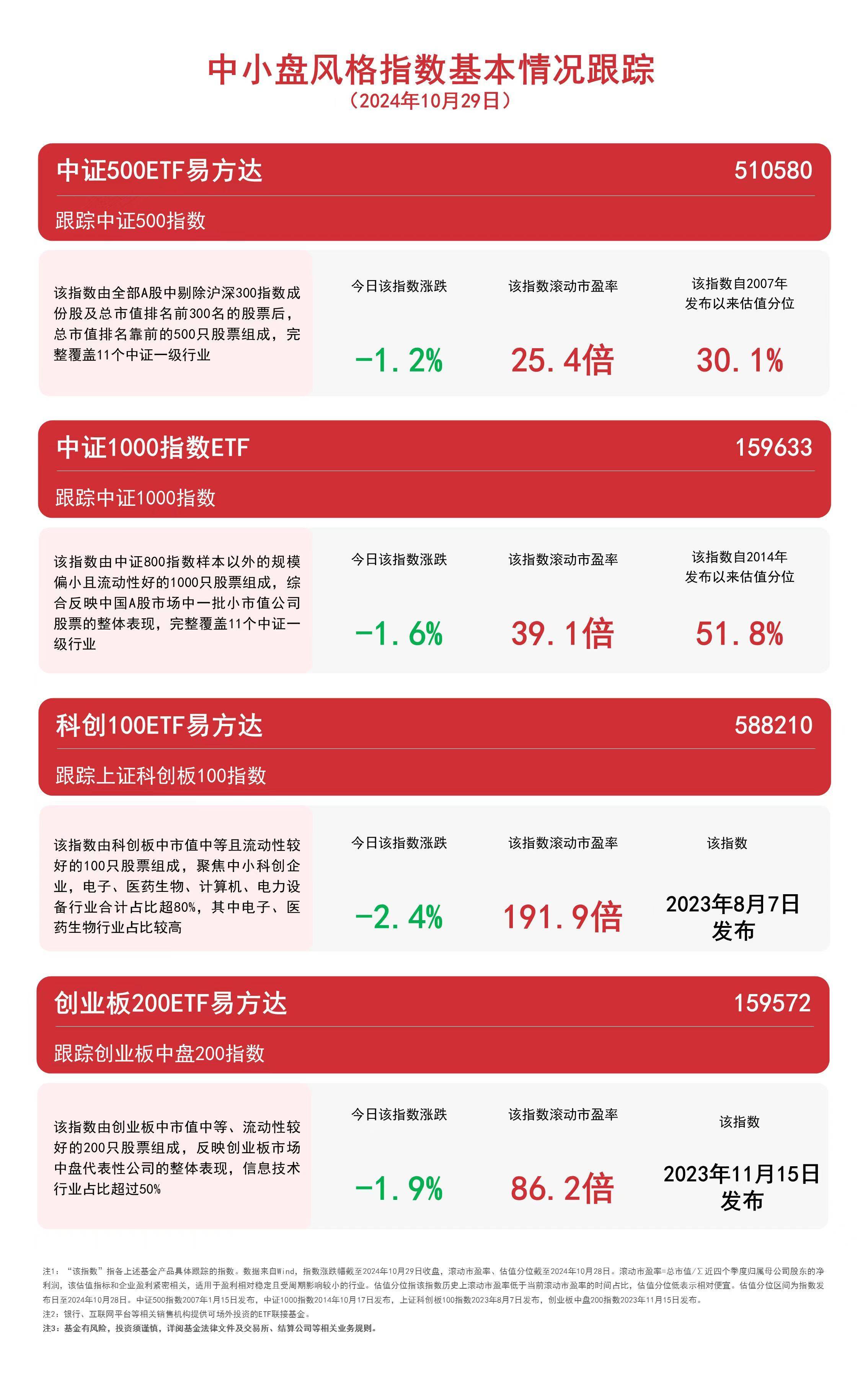 截至收盘,今日中证500指数下跌1.2%,中证1000指数下跌1.6%,科创100指数下跌2.4%,创业板中盘200指数下跌1.9%。
