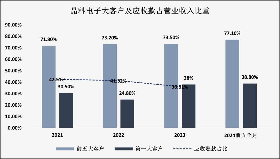 根据招股说明书数据,晶科电子高度依赖大客户,2021年至2024年前五个月,前五大客户占其营收比重分别为71.8%、73.2%、73.5%和77.1%;第一大客户占比为30.5%、24.8%、38%和38.8%。根据业务划分看,2024年前五个月: