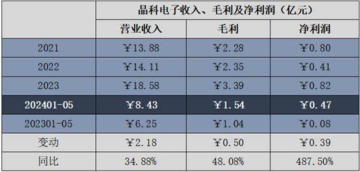 根据招股书显示,晶科电子2021年至2023年,营业收入从13.88亿元持续提升至18.58亿元,净利润从0.8亿元持续增长至0.82亿元;2024年前五个月,营收同比增长34.88%至8.43亿元,净利润同比暴涨4.8倍至0.47亿元;靓丽的业绩表现的背后有着强大的资本运作。