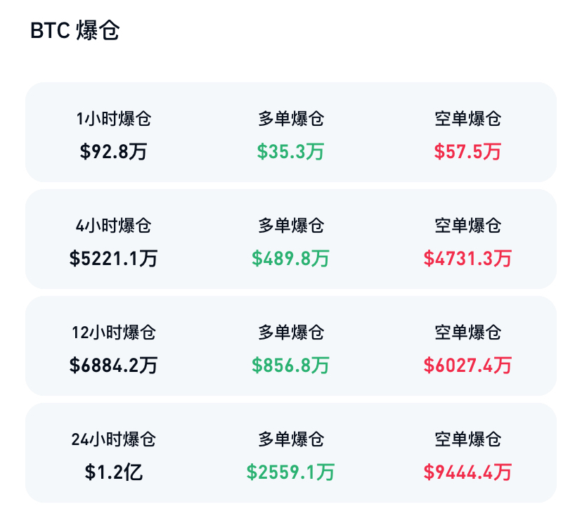 CoinGlass数据显示,过去24个小时,比特币全网爆仓1.2亿美元,其中空单爆仓9444.4万美元,多单爆仓2559.1万美元。