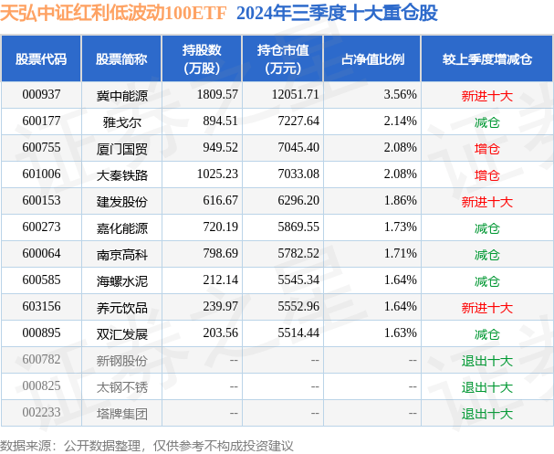 天弘中证红利低波动100ETF为指数型-股票基金,根据最新一期基金季报显示,该基金资产配置:股票占净值比100.08%,无债券类资产,现金占净值比0.15%。基金十大重仓股如下: