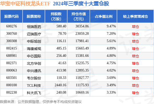 华宝中证科技龙头ETF为指数型-股票基金,根据最新一期基金季报显示,该基金资产配置:股票占净值比98.18%,无债券类资产,现金占净值比1.88%。基金十大重仓股如下: