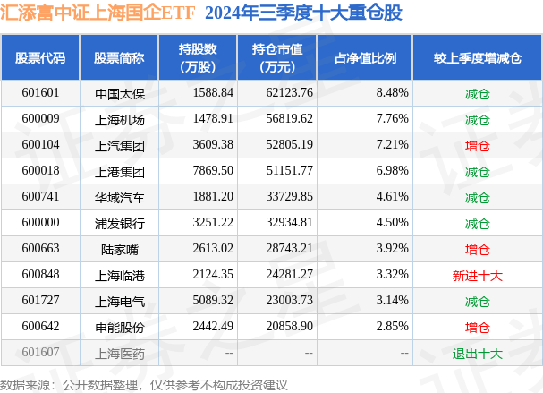 汇添富中证上海国企ETF为指数型-股票基金,根据最新一期基金季报显示,该基金资产配置:股票占净值比98.28%,无债券类资产,现金占净值比1.65%。基金十大重仓股如下: