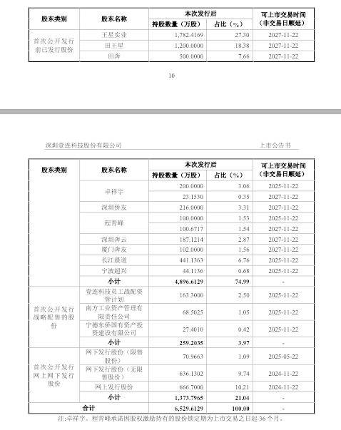 招股书显示,壹连科技实际控制人为田王星、田奔父子。IPO后,田王星直接持有公司约18.38%股份,田奔直接持股约7.66%,同时二人通过王星实业、深圳奔云、深圳侨友、厦门奔友间接持有公司35.04%股份;此外,长江晨道作为最大外部股东,持股约6.76%。