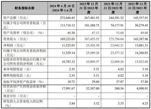 报告期内,壹连科技营业收入分别约为6.99亿、14.34亿、27.58亿、30.75、16.92亿元;归母净利润分别约为6560.22万、1.43亿、2.36亿、2.60亿、1.15亿元;扣非归母净利润分别约为5360.65万、1.39亿、2.20亿、2.50亿、1.08亿元;综合毛利率分别为23.09%、21.69%、19.54%、18.94%、16.17%,持续逐年走低。